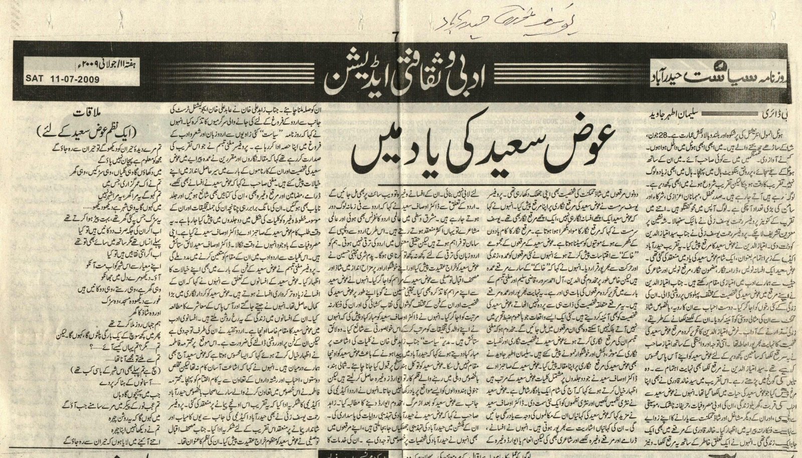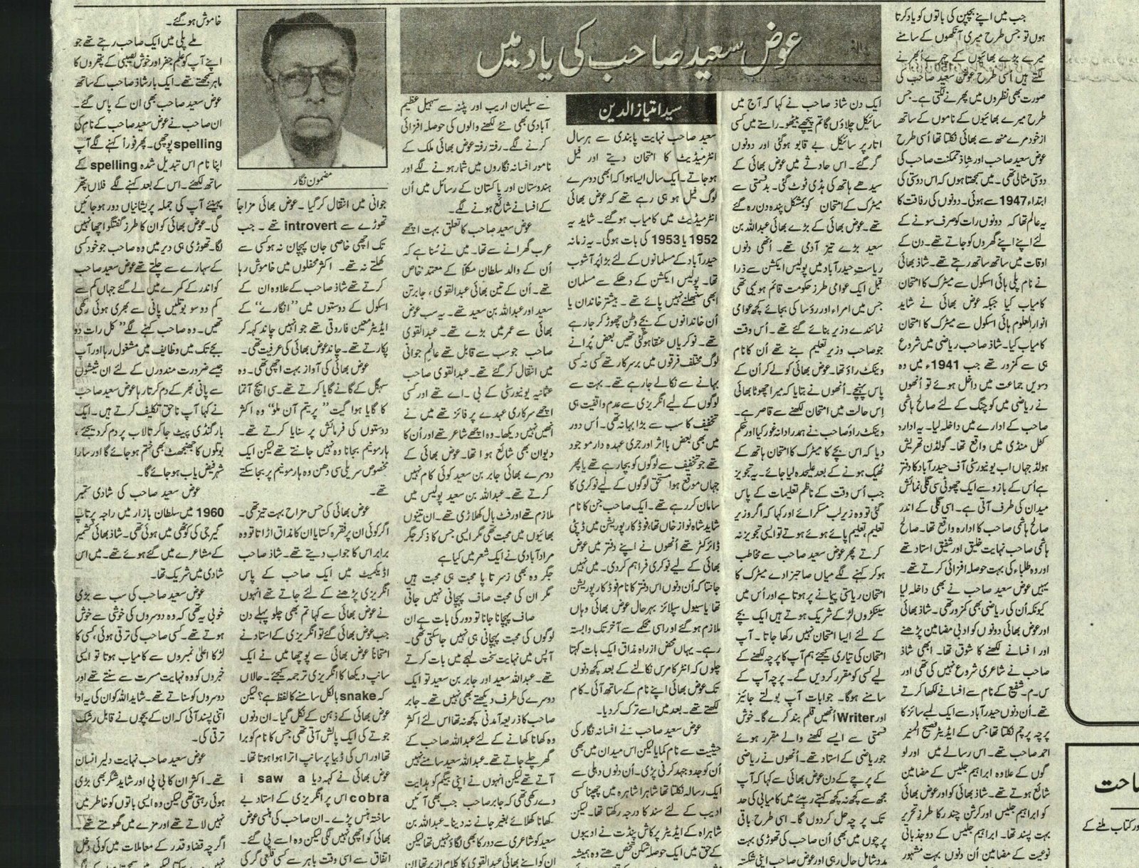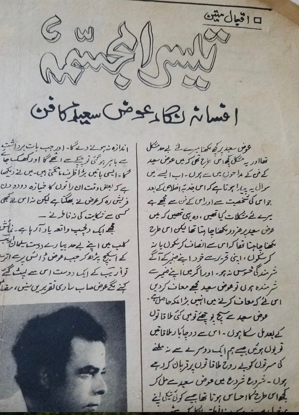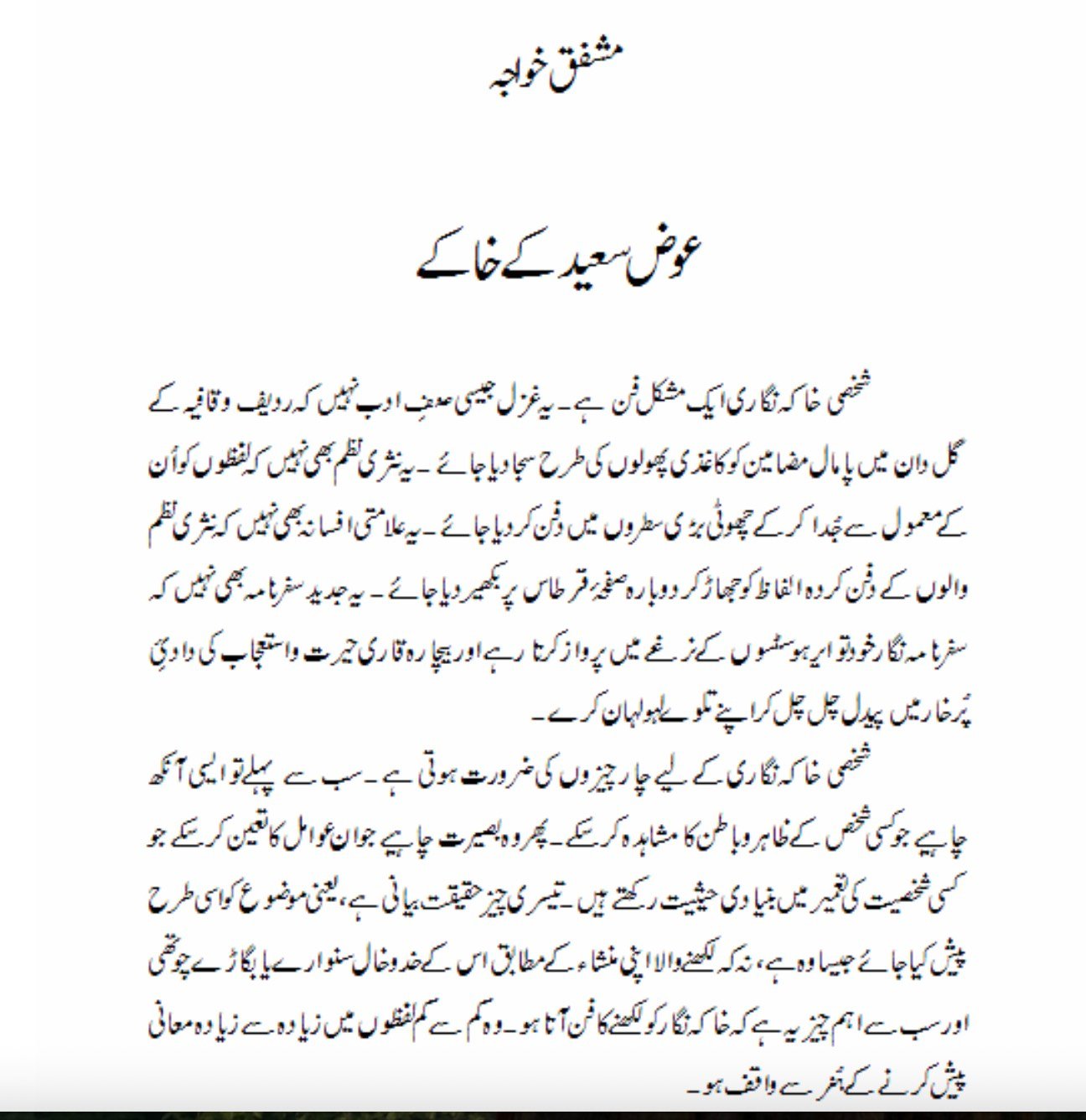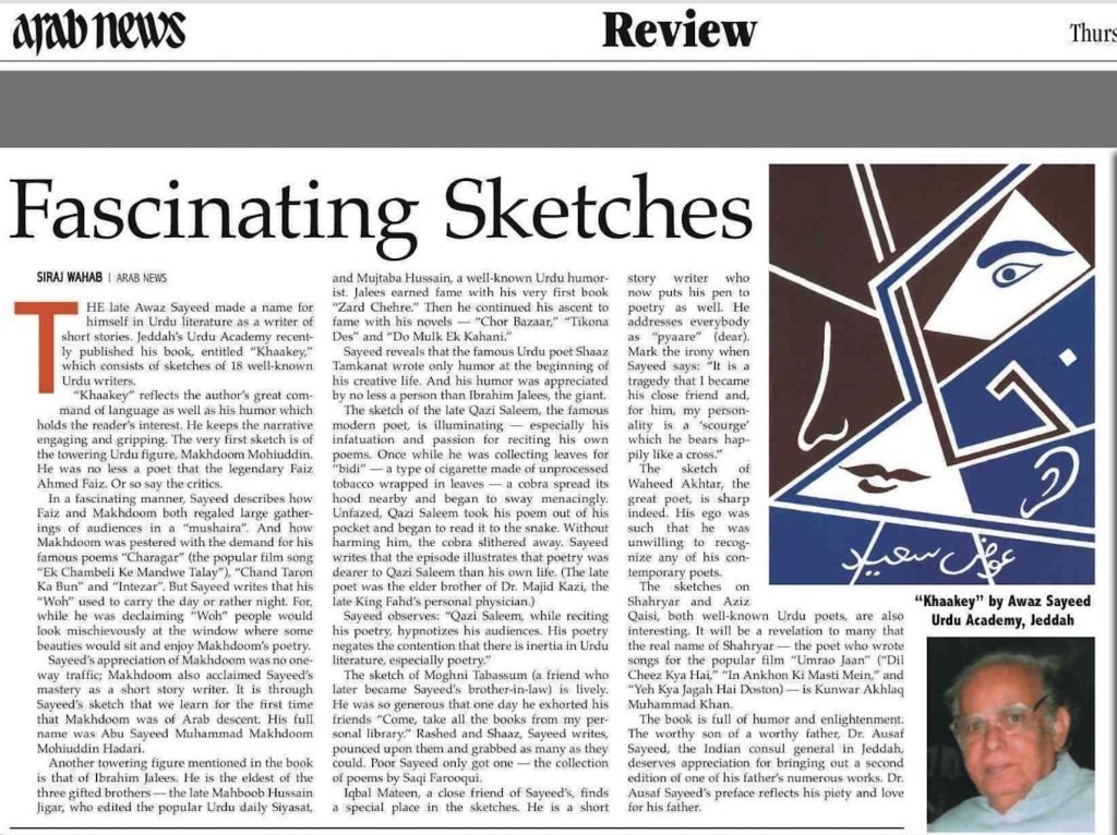 This section features articles written about Awaz Sayeed’s life and works by his contemporaries, friends, and others, including Dr Mehdi Jafer, Mujtaba Hussain, Mushfiq Khwaja, Iqbal Mateen, and Syed Khalid Qadri. The articles have been written in both Urdu and English.